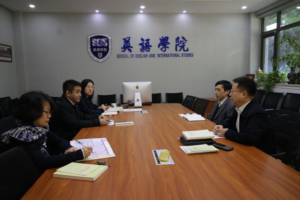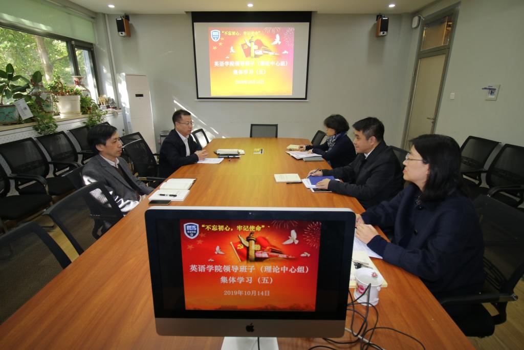 2019年10月14日上午,英语学院领导班子召开第五次集体学习研讨。本次学习研讨的主题是“深入学习贯彻习近平总书记关于全面从严治党的重要论述,加强学院党的基层组织建设,落实立德树人根本任务,深化学院人才培养模式改革”。领导班子成员路兴、张剑、孟庆琨、王展鹏、张莲参加学习研讨。