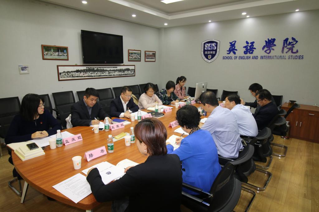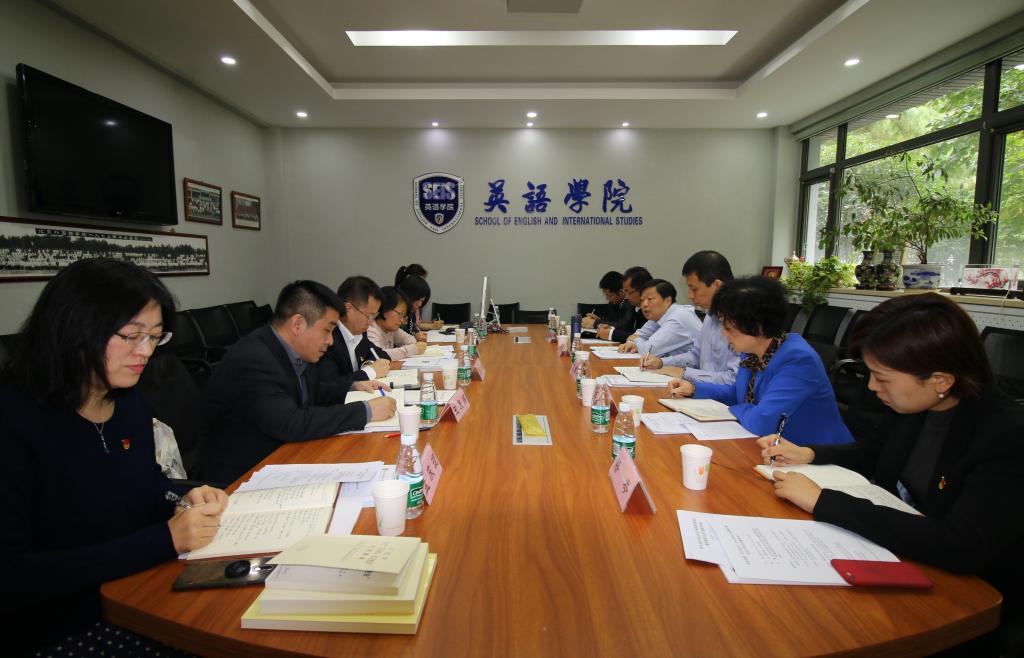2019年10月11日上午,英语学院领导班子召开第四次集体学习研讨。本次集体学习研讨的主题是“深入学习贯彻习近平关于教育的重要论述,切实提高扎根中国大地办世界一流学科的主观能动性。”教育部直属高校“不忘初心,牢记使命”主题教育第三巡回指导组董俊敏处长和刘凯峰同志,学校党委宣传部常务副部长、主题教育领导小组办公室成员刘生全同志,学校主题教育领导小组办公室评估督导组潘华珍、李勇、滕岑等莅临学院检查督导。领导班子成员路兴、孟庆琨、彭萍、王展鹏、张莲及工会主席、教工行政党支部书记王欣扬参加学习研讨。