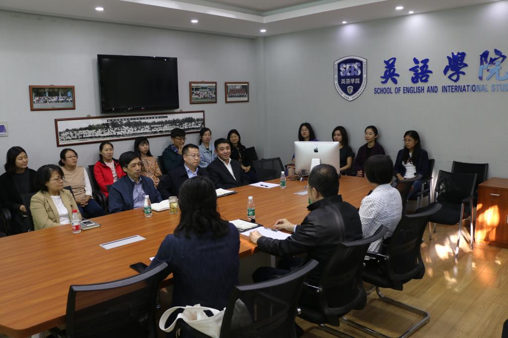 英语学院院长张剑、党总支书记路兴分别对彭萍教授的到来表示热烈欢迎。张表示,领导班子需要团结协作、共同推进英院建设,并对今后的工作进行了初步安排,彭萍老师将主要负责学院外事及科研相关工作;路兴首先感谢学校党委能够及时为学院安排空缺的副院长人选,同时表示,学院也将全力帮助、支持彭萍老师工作。