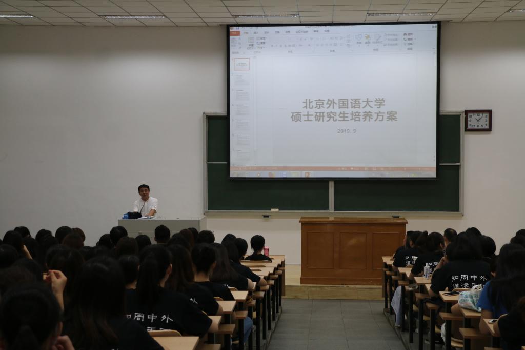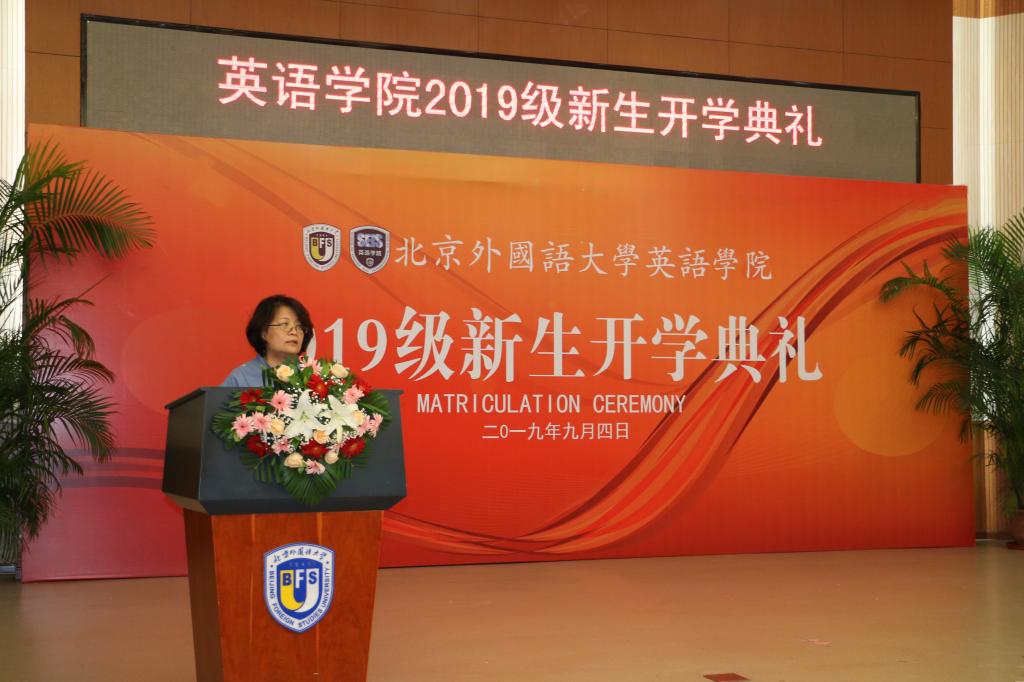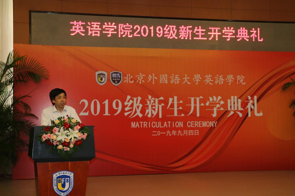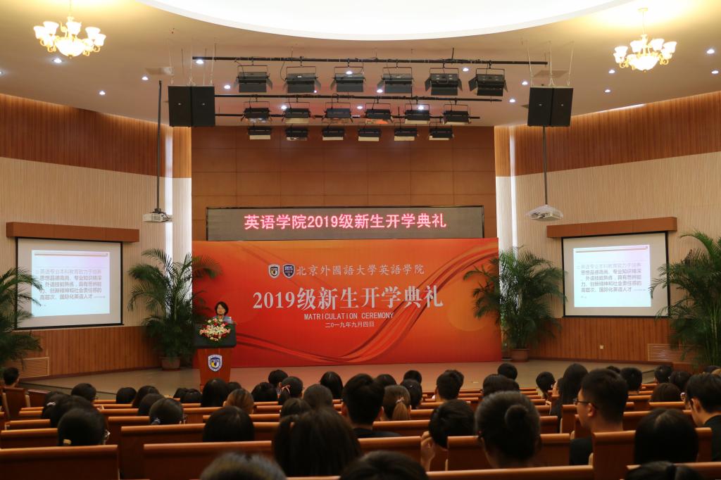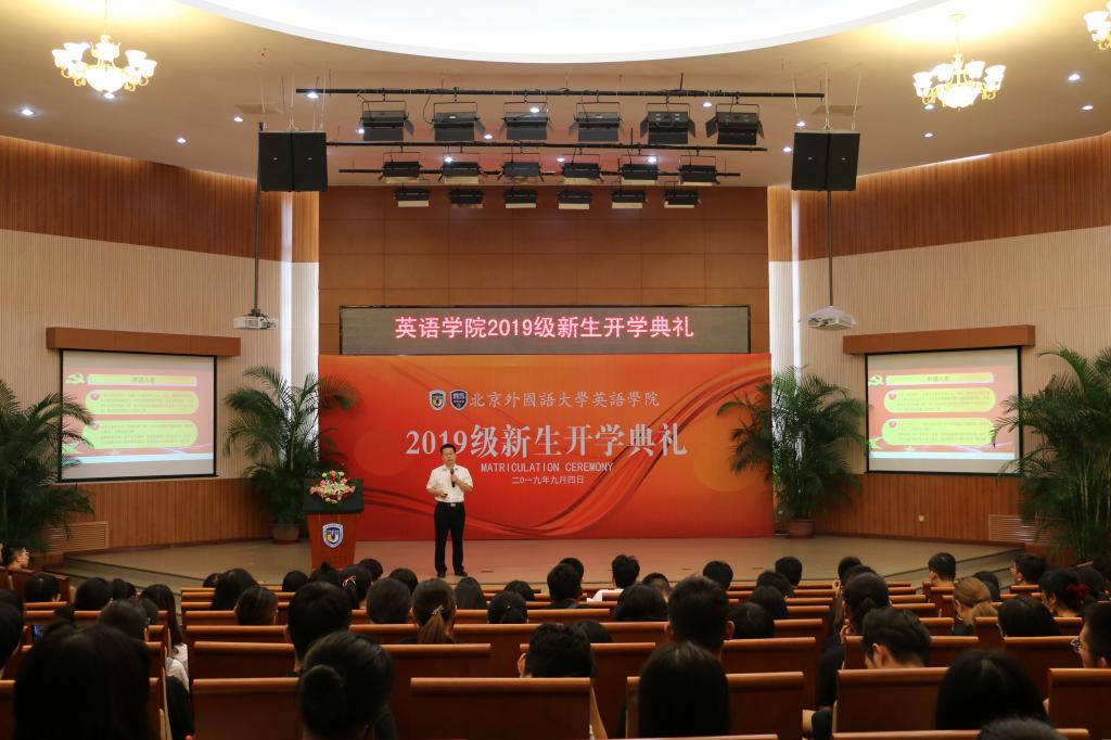 2019年9月4日上午,北京外国语大学英语学院2019级新生开学典礼于阿语楼国会厅顺利举行。英语学院院长张剑、党总支书记路兴、英语学院副院长张莲、党总支副书记孟庆琨、院长助理吴文安,各研究中心主任、本科生主任、教师代表、辅导员以及2019级研究生、本科生参加本次开学典礼。