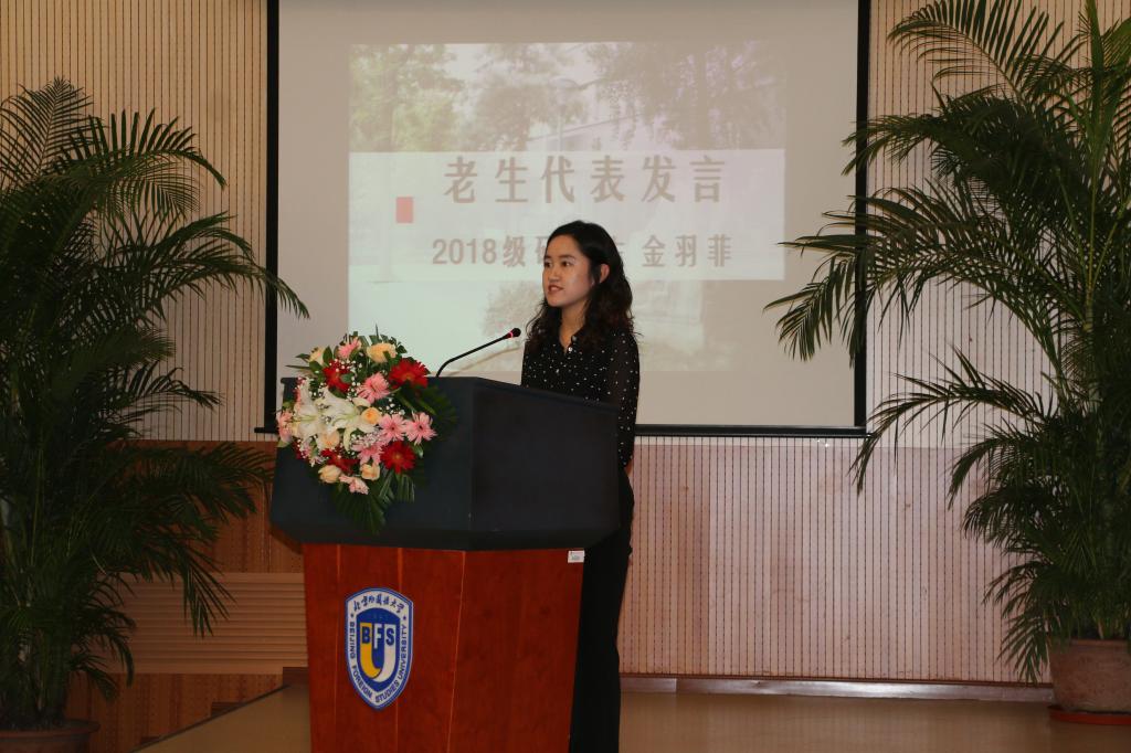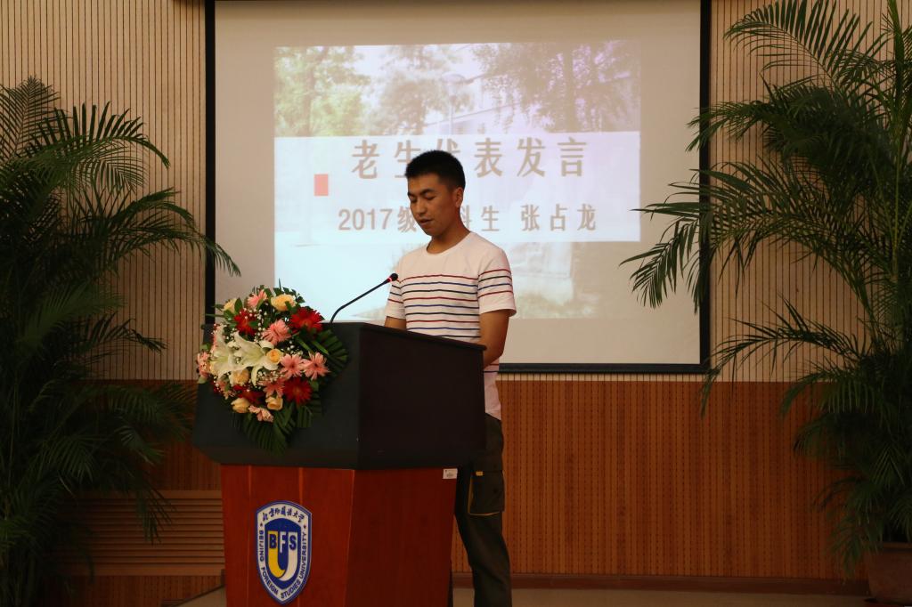 随后,老生代表2018级研究生金羽菲、2017级本科生张占龙;新生代表2019级本科生魏子淮相继发言,从大学努力方向和国家情怀培养的角度分享了自己对北外英语学院学习生活的感悟和向往。