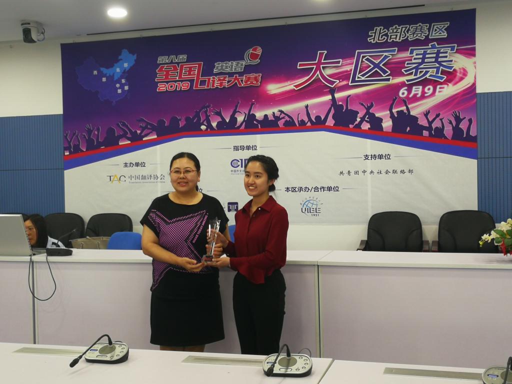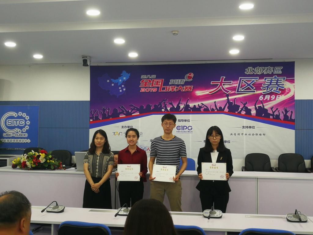 2019年6月9日,第八届全国口译大赛北部大区赛在对外经济贸易大学落下帷幕。北京外国语大学英语学院学生在大赛中表现优异。其中,金羽菲同学获一等奖,潘婷立、尹佩璇、侯玉颖同学获二等奖,谢怡凡同学获三等奖,赵世明同学获优秀奖,王颖冲老师获优秀指导教师奖。