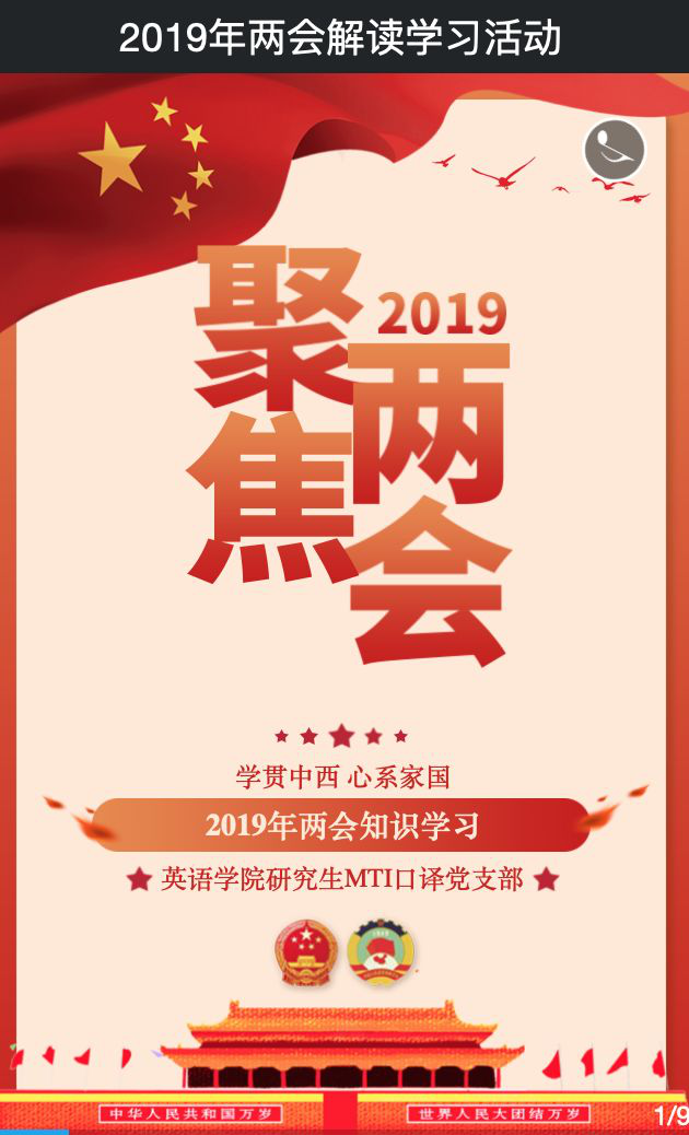 2019年“两会”暨第十三届全国人民代表大会二次会议、全国政协十三届二次会议分别于3月5日-15日、3月3日-13日在北京胜利召开。今年的“两会”对贯彻落实习近平新时代中国特色社会主义思想和党的十九大精神,动员全党全国各族人民为决胜全面建成小康社会、夺取新时代中国特色社会主义伟大胜利而不懈奋斗具有十分重要的意义。李克强总理所作的《政府工作报告》完整地描绘了过去一年,在面临前所未有的国内外复杂严峻形势下,我国在经济、军事、教育、环境等各方面取得的巨大成就,为我国下一步发展定下了切实可行的目标。自“两会”开幕以来,英语学院研究生团总支不断组织学生通过网络、电视、手机APP等多种渠道,积极收听收看“两会”盛况,关注“两会”进程,组织主题辩论、模拟“两会”交传、海报设计、新媒体制作等丰富多彩的教育学习活动。