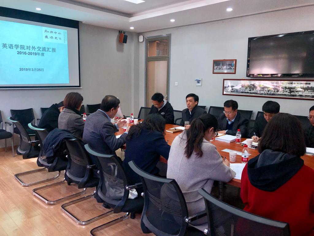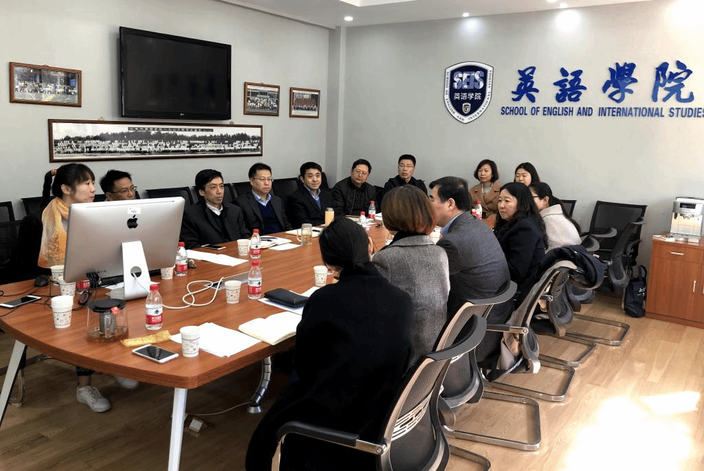 2019年3月25日上午,北京外国语大学副校长闫国华、孔子学院工作处处长金利民、国际交流与合作处处长柯静、国际交流与合作办公室朱雯、杜书灵、留学生办公室姜颖、唐霞一行七人走访英语学院,调研我院国际交流与合作工作。