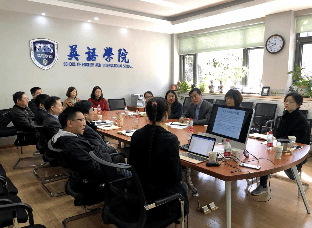 英语学院国际交流主管副院长谢韬代表学院就相关工作做以简要汇报。汇报从我院国际交流理念及措施入手,分别介绍了英语学院海外合作项目、来华留学生项目、教师出国进修、海外专家聘请及外事活动等情况,最后提出了学院现工作中面临的几点问题。与会人员就相关问题进行了深度探讨,包括如何解决留学生学籍管理、系统数据统计问题,外籍教师工资及国民化待遇问题,学院相关工作安排等。随后,英语学院院长张剑、党总支书记路兴、研究生教学主管副院长王展鹏、翻译方向负责人吴文安、本科教学主管赵冬等人也分别简述了学院目前相关工作情况及问题。