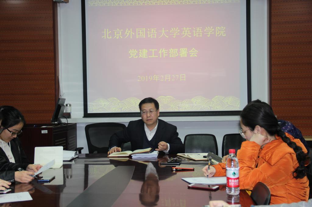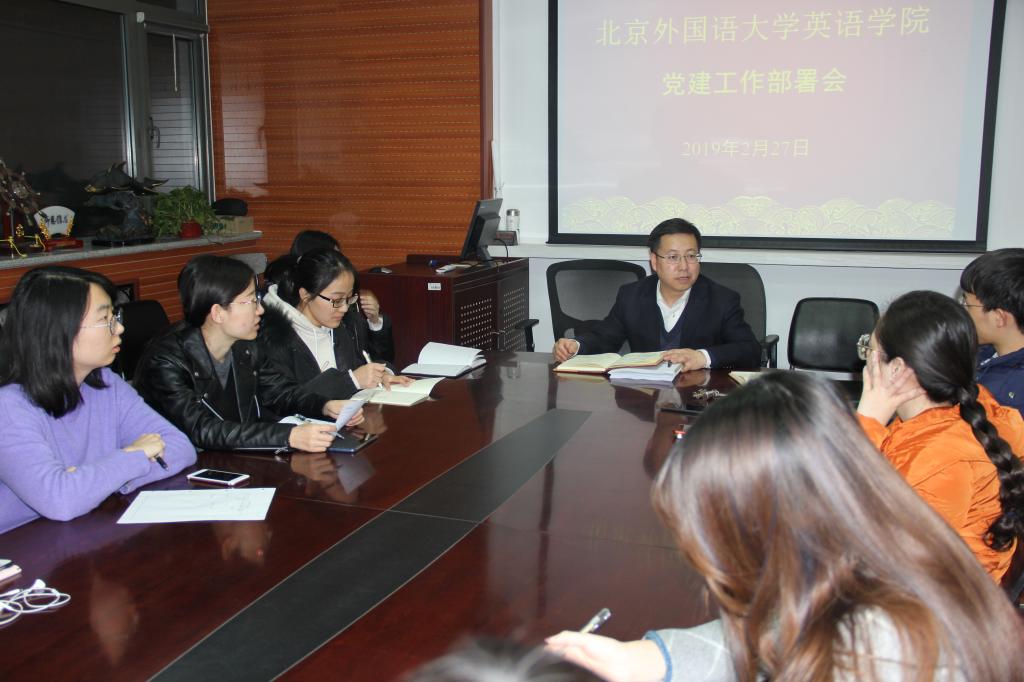 2月27日周三晚7点,在英语学院115会议室,召开2018-2019学年第二学期党建工作部署会。党总支书记路兴主持,辅导员于承杰、学生党支部书记参加。