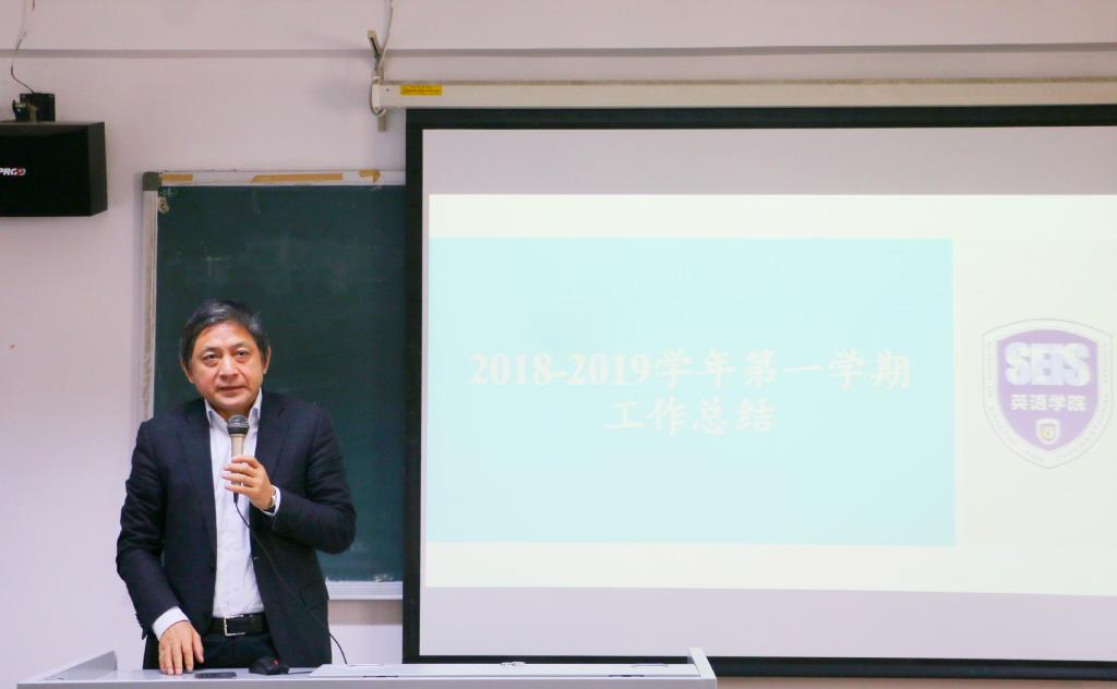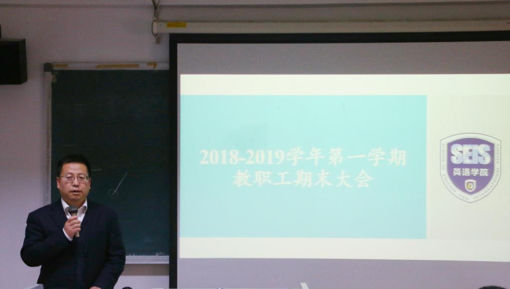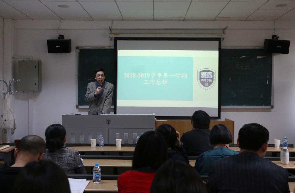 2019年1月11日上午,英语学院在417教室组织召开2018-2019学年第一学期期末工作总结会。会议由英语学院党总支书记路兴主持,学校分管联系英语学院工作的校领导彭龙校长莅临指导并讲话。英语学院全院教职员工出席参会。