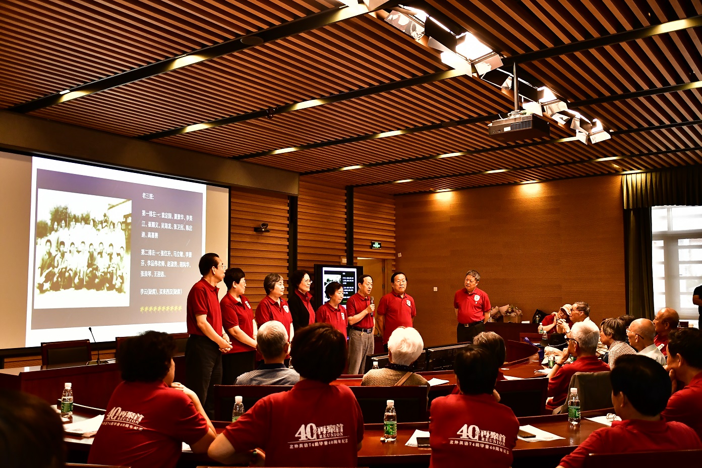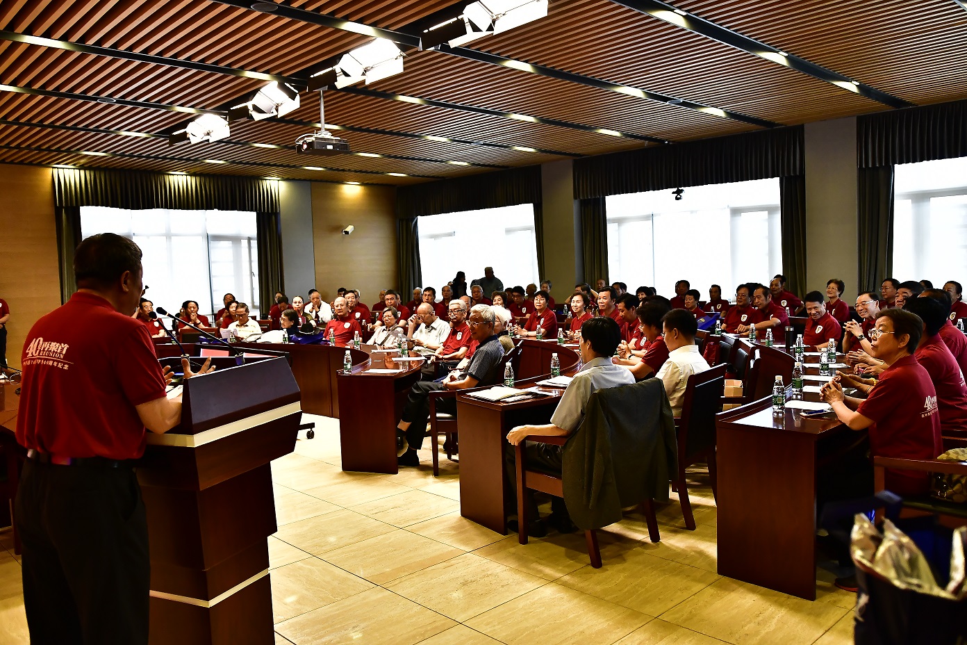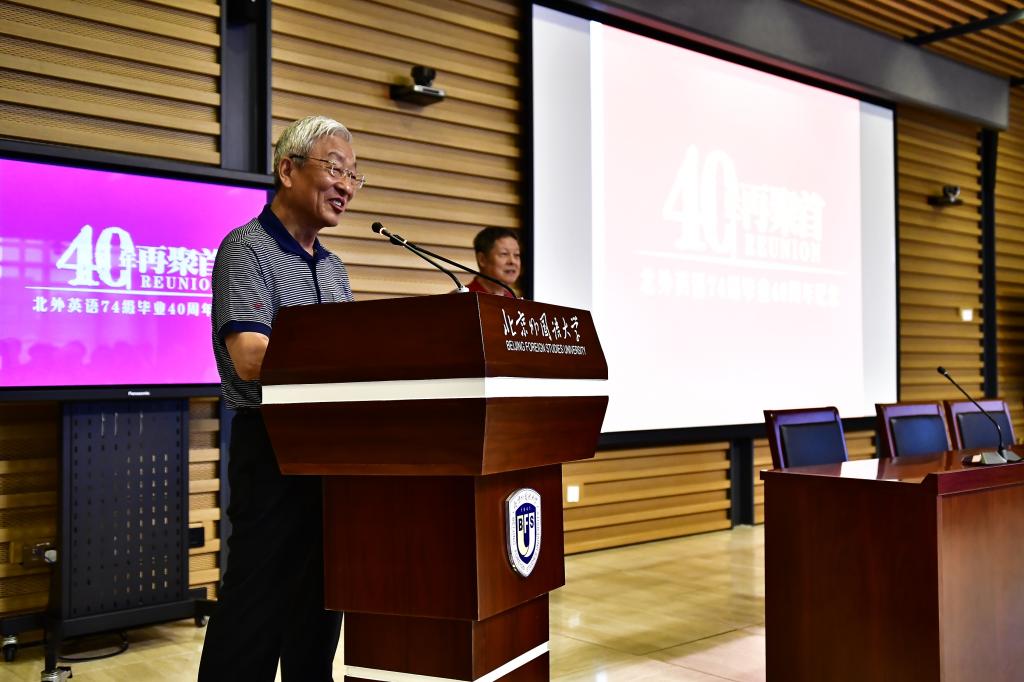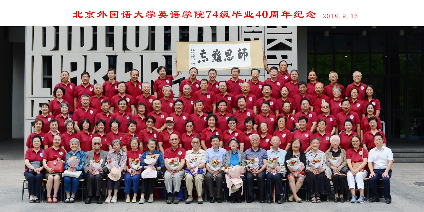 9月15日,北京外国语大学77周年校庆之际,英语学院迎来了部分校友返校。其中最大规模的英语学院1974级校友毕业40周年纪念活动在图书馆五层学术报告厅举行,来自全国和世界各地的近80位校友和10多位昔日恩师齐聚一堂,共同追忆往日的校园生活。北京外国语大学校友会会长,原党委书记杨学义、英语学院院长张剑、英语学院党总支书记路兴出席此次活动。活动由校友代表吴天鹏主持。