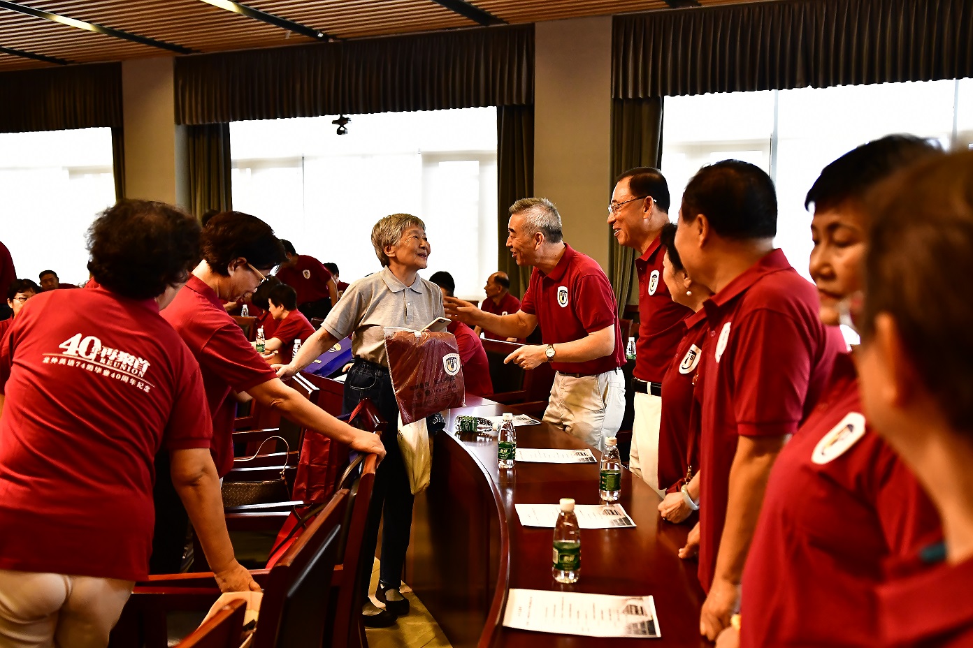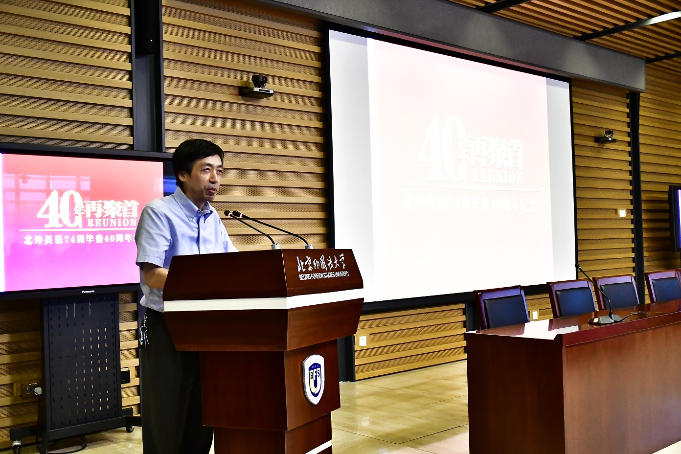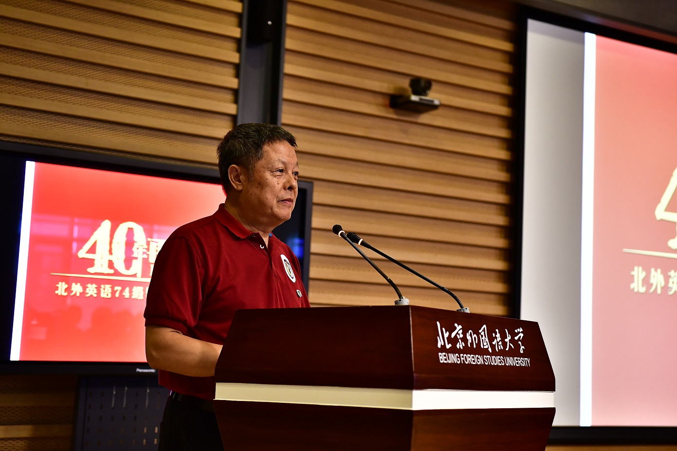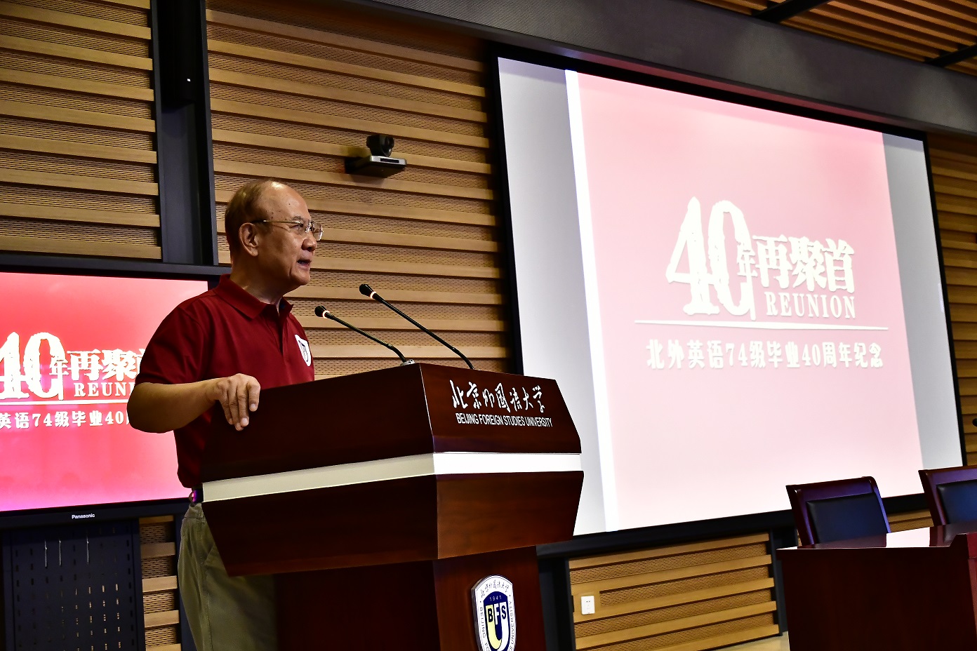 9月15日,北京外国语大学77周年校庆之际,英语学院迎来了部分校友返校。其中最大规模的英语学院1974级校友毕业40周年纪念活动在图书馆五层学术报告厅举行,来自全国和世界各地的近80位校友和10多位昔日恩师齐聚一堂,共同追忆往日的校园生活。北京外国语大学校友会会长,原党委书记杨学义、英语学院院长张剑、英语学院党总支书记路兴出席此次活动。活动由校友代表吴天鹏主持。
