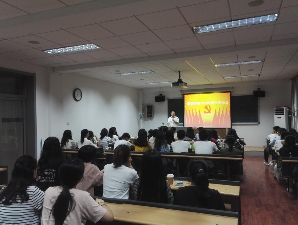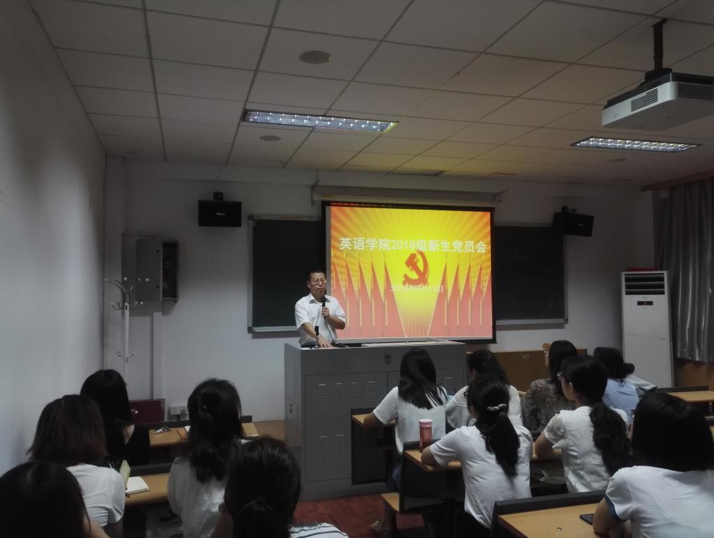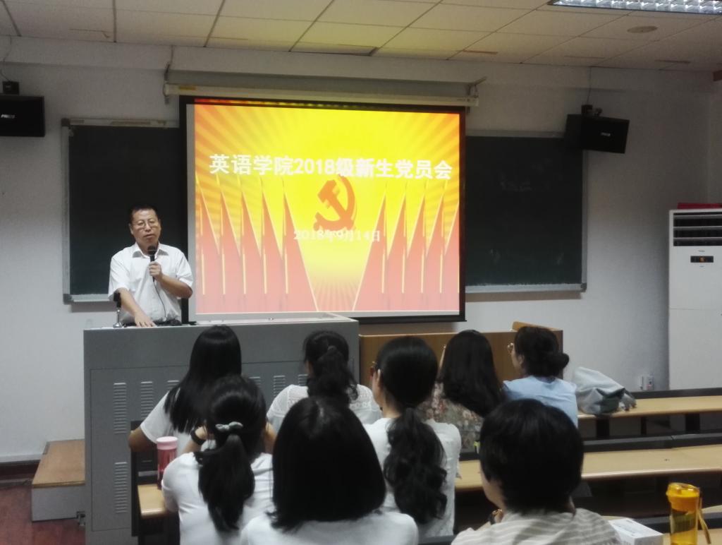 2018年9月14日晚7点,在英语学院417教室,英语学院党总支召开2018级研究生新生党员大会。大会由党总支书记路兴主持,2018级研究生辅导员于承杰老师、研究生各党支部书记及2018级研究生党员参加。