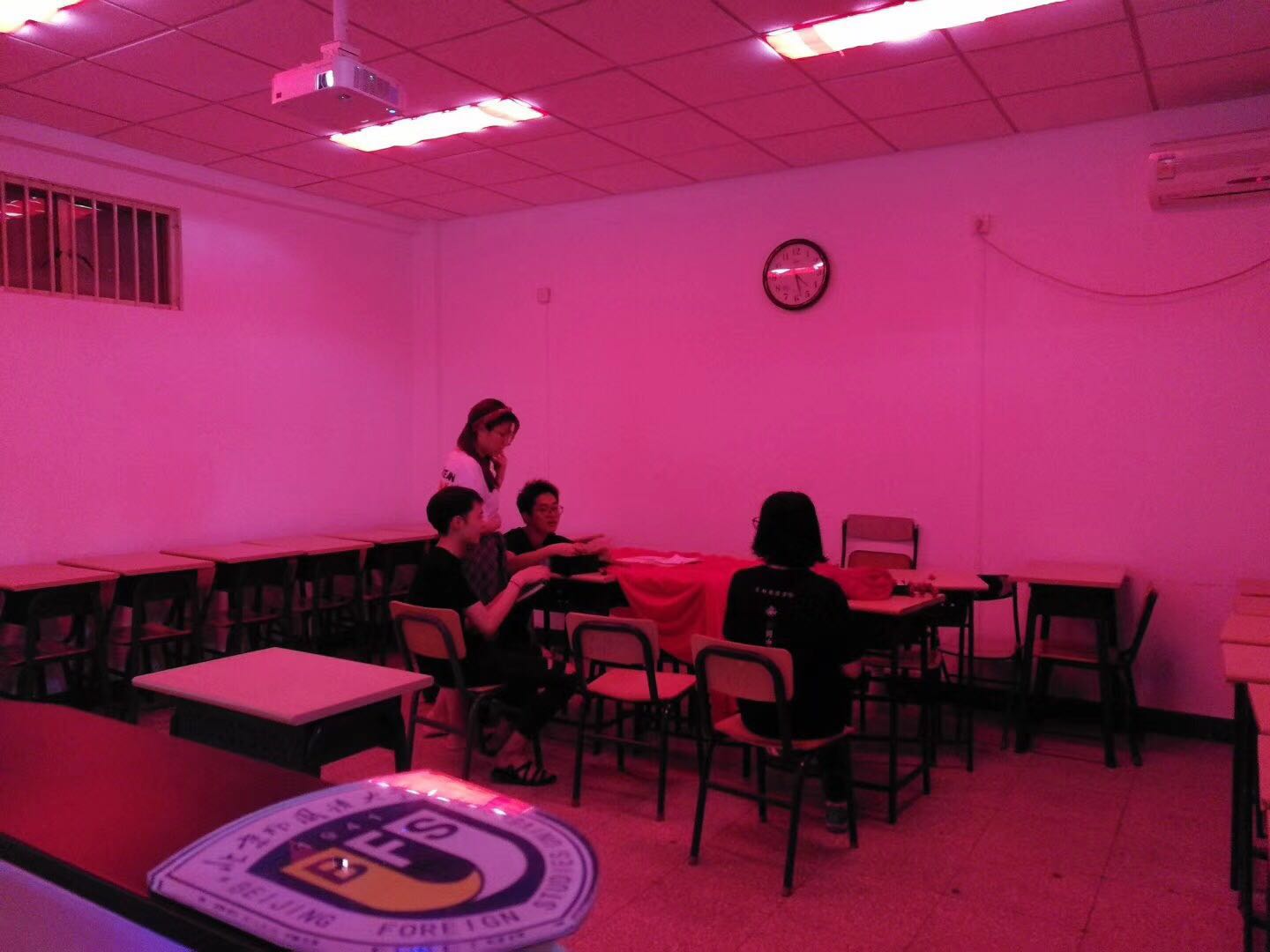 ——“DeBlock”密室逃脱活动采用常见的密室逃脱游戏形式:将一组四到七人的玩家置于办公室精心布置的“密室”(英语学院的教室)中,在规定的四十分钟之内,通过房间内工作人员的提示和用心设计的线索,玩家收集信息,从而走出密室。本次密室在原来的基础上对密室房间进行了创新,加入了双房间联动、双关卡等特点。游戏过程中,玩家在享受发现的乐趣、解谜的成就之时,也体会到了团队合作的重要和英语国家文化的迷人之处。