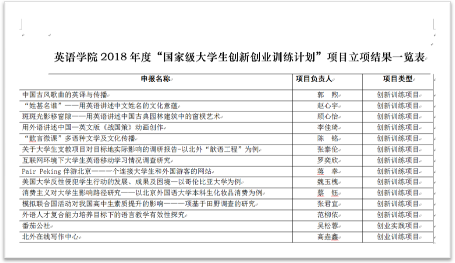 ——英语学院高度重视对本科生创新创业训练的教育指导。曾于3月21日晚,召开2018年“国家级大学生创新创业训练计划”立项申报说明会,邀请副院长谢韬为有意申报立项的本科生进行了指导。立项后,学院将协调指导老师认真指导项目的开展,督促项目负责人按时高质量完成好项目。