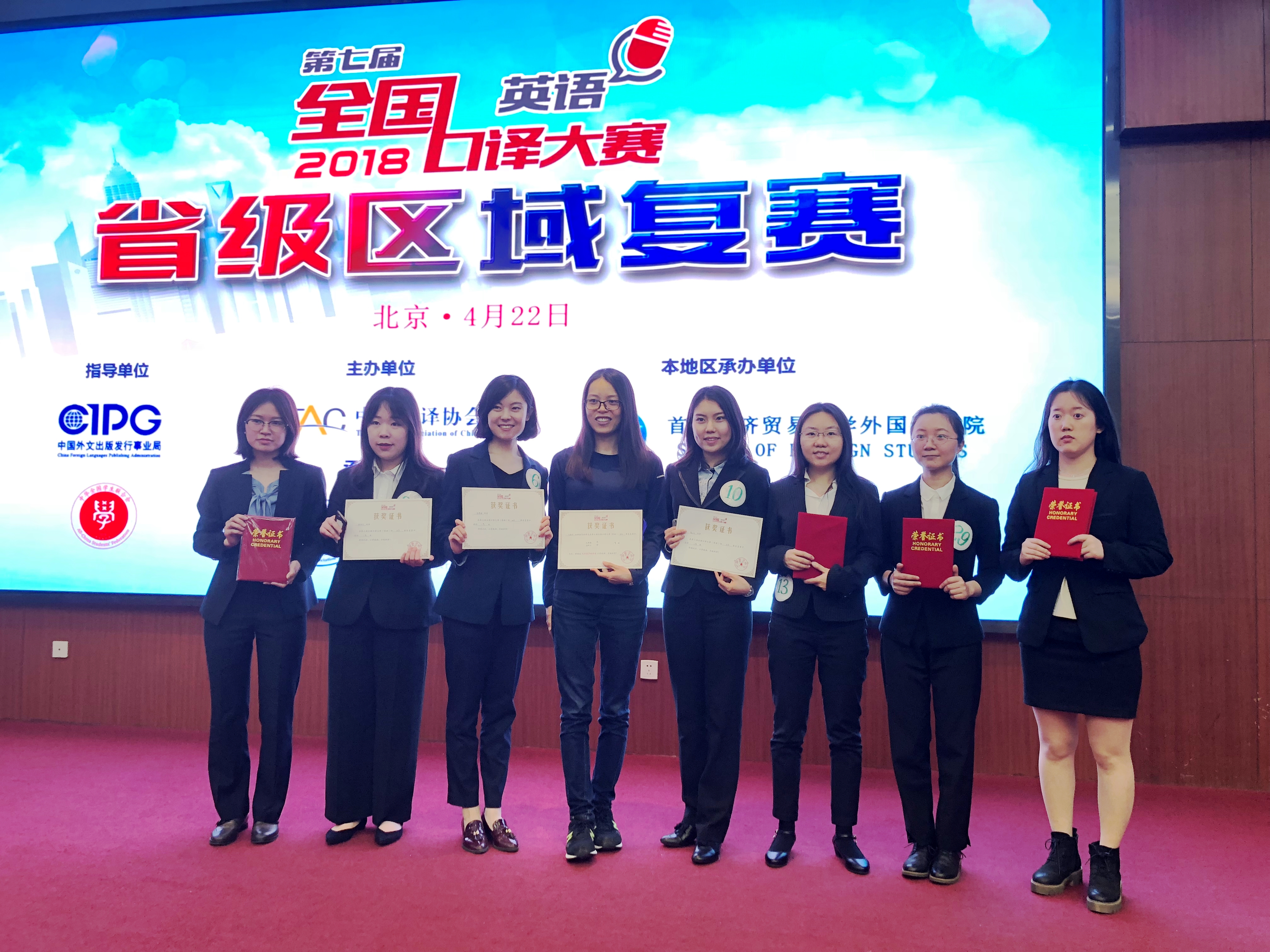 ——2018年4月22日,第七届全国口译大赛北京赛区复赛在首都经济贸易大学隆重举行。经过一天激烈的角逐,英语学院MTI口译专业研二学生侯博雅、研一学生潘婷立获一等奖(大赛共设3名一等奖),MTI口译专业研一学生侯玉颖、翻译系大三学生谢怡凡获二等奖,MTI口译专业研二学生李欣蕊、翻译系大四学生崔心仪获三等奖,跻身华北大区赛。王颖冲老师获优秀指导教师奖。