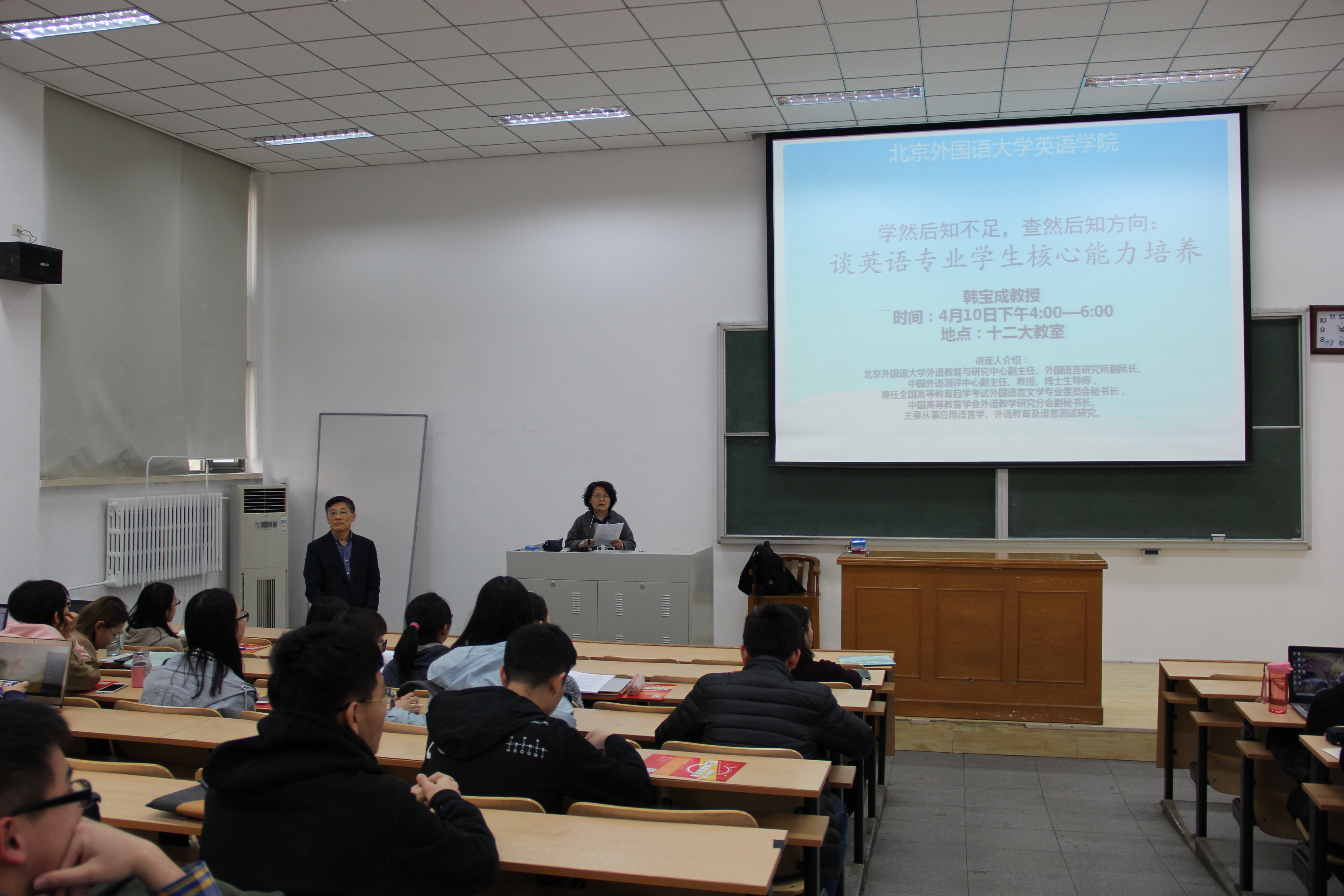 ——4月10日下午4:00,我校十二大教室,英语学院邀请了我校外语教育与研究中心副主任、外国语言研究所副所长、中国外语测评中心副主任韩宝成教授为学生们做了“学然后知不足,查然后知方向:谈英语专业学生核心能力培养”的学术讲座。英语学院副院长张莲教授主持讲座,辅导员张春霞组织协调。