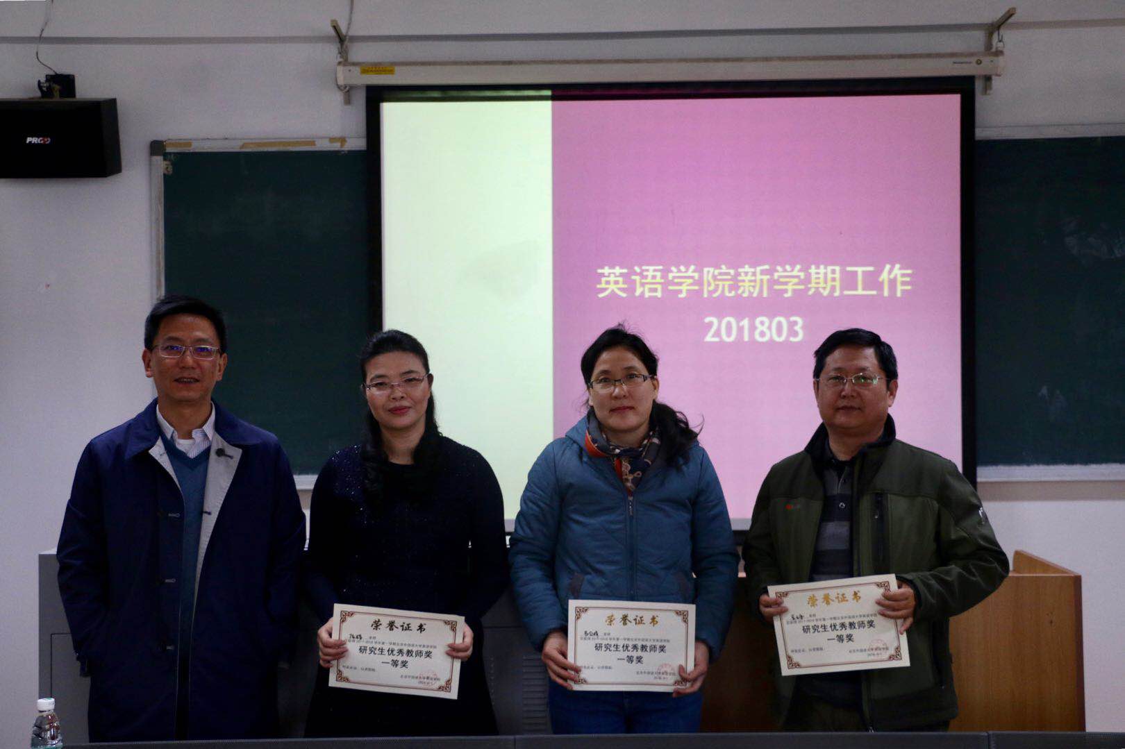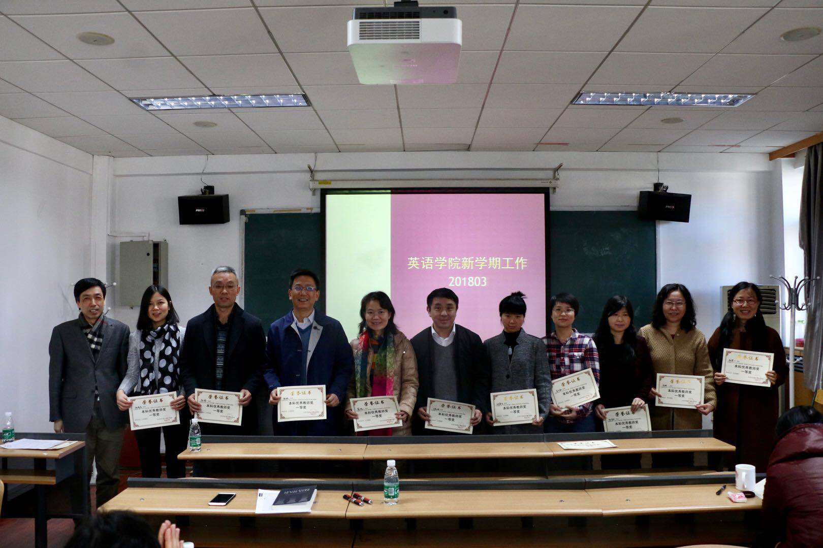——会议最后,对2017-2018学年第一学期优秀教师及先进工作者进行了表彰。奖项共分“本科生教学优秀奖”、“研究生教学优秀奖”、“预科班教学优秀奖”、“同等学力研修班教学优秀奖”及“先进工作奖”六项。