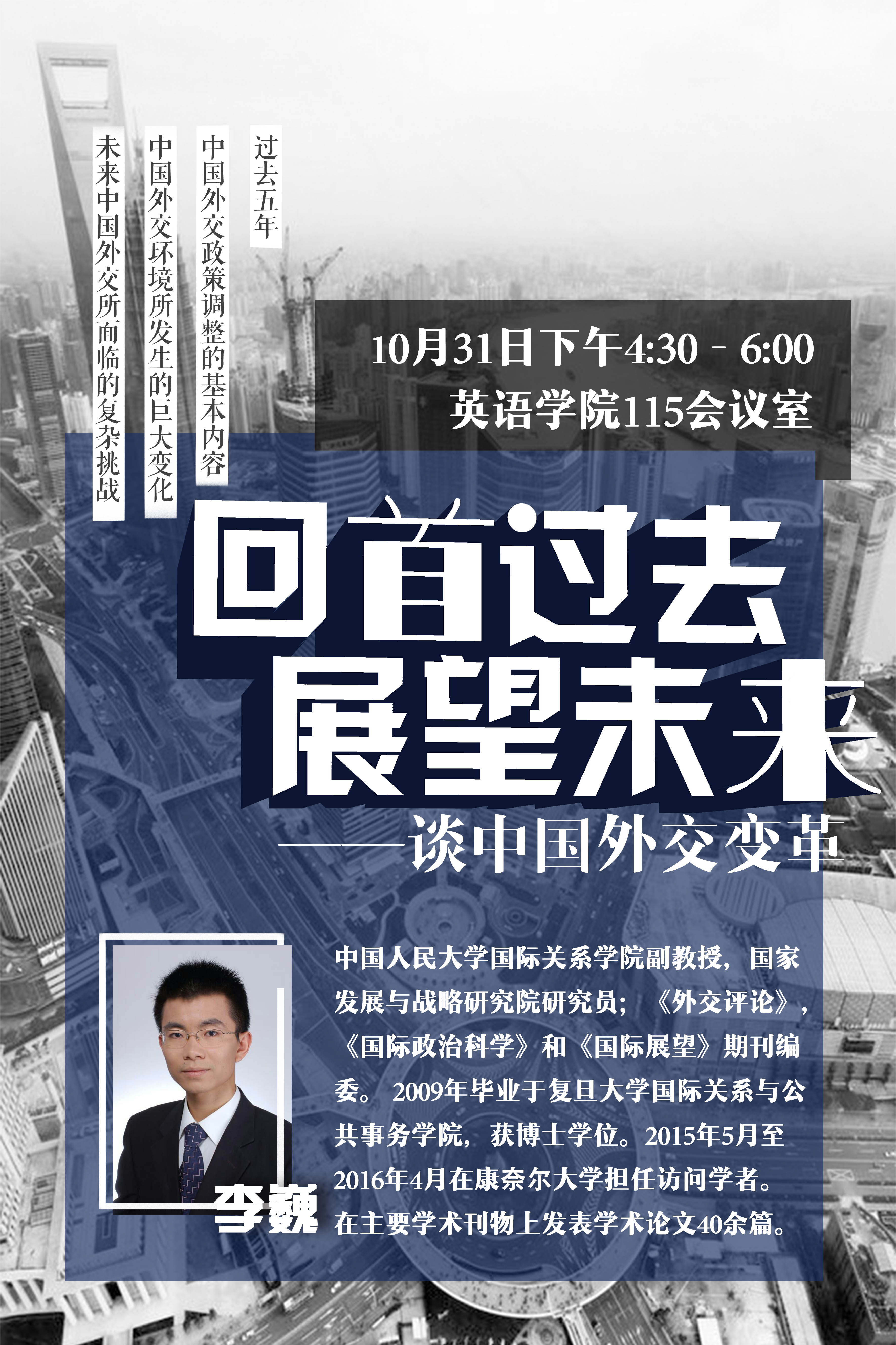 ——2017年10月-11月期间,英语学院组织国际问题研究青年学者系列讲座,该系列讲座是英语学院谢韬教授主持的“新型国际关系构建下的中美关系研究”青年创新团队项目的一部分,旨在促进项目成员与国内国际关系研究领域优秀青年学者之间的学术交流,激发北外师生在国际关系研究领域的学习热情。