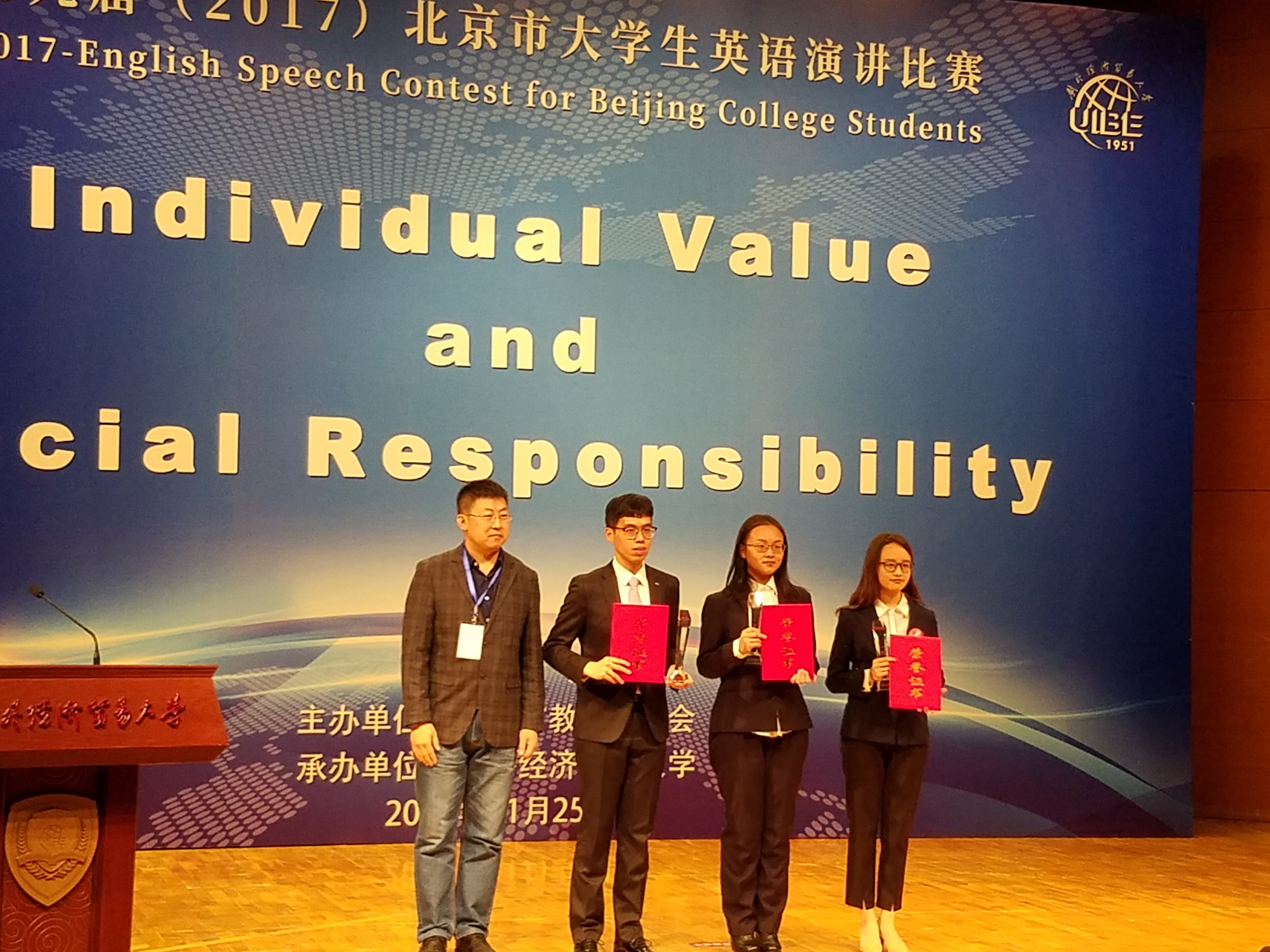 ——这次获奖的范柳依同学是英语学院演讲队成员。英语学院为鼓励学生对英语演讲的兴趣成立了演讲队,指定教师做演讲队指导,定期训练,吸引了英院学生以及其他院系志在参加演讲比赛的同学们,多年来演讲队成员曾获得外研社杯、21世纪杯、首都高校英语演讲比赛等多个赛事的多项奖项。