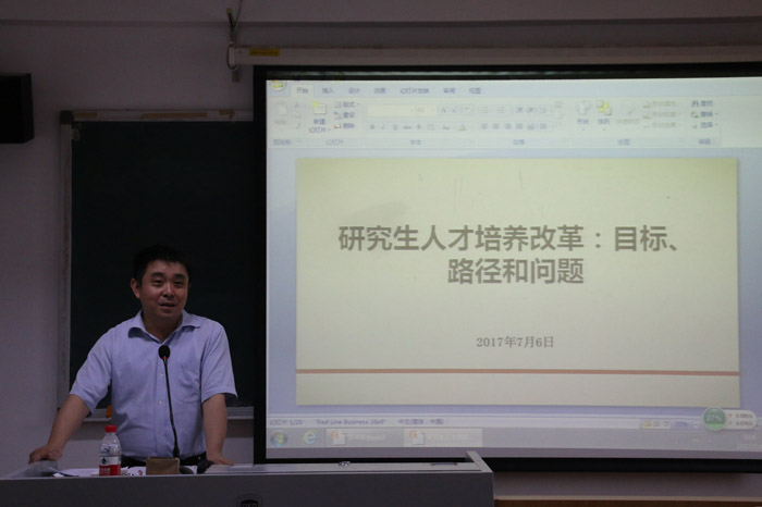 ——在7月6日上午的研究生人才培养改革研讨会上,副院长王展鹏教授和谢韬教授分别作了题为“英语学院研究生人才培养改革:目标、路径和问题”和“研究中心的科研职能与研究生培养”的发言。全院教师围绕“如何提高研究生生源质量”、“如何提高研究生培养质量”、“如何引导学生参与学术活动和科研工作”等问题展开了讨论。
