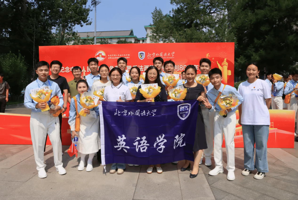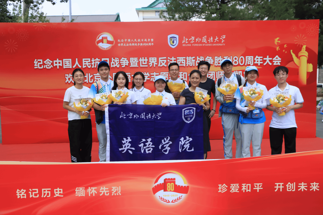 2025年9月3日,纪念中国人民抗日战争暨世界反法西斯战争胜利80周年大会在天安门广场隆重举行。北外英语学院有10名合唱团成员、23名志愿者,在天安门广场和各志愿服务岗参加了此次纪念活动。