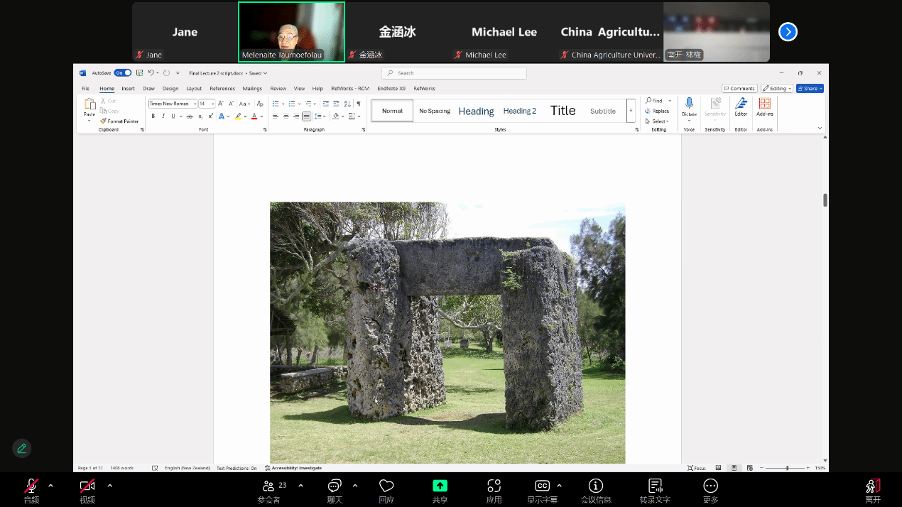 2025年6月3日下午,应北京外国语大学英语学院南太平洋研究中心和世界语言博物馆的邀请,汤加语外国专家梅莱奈伊特·塔乌莫艾富拉乌(Melenaite Taumoefolau)博士在线上做了题为“汤加景点背后的传说”(Legends behind scenic spots in Tonga)的讲座。讲座由英语学院教师李菅主持,来自校内外多名师生参加了本场讲座。