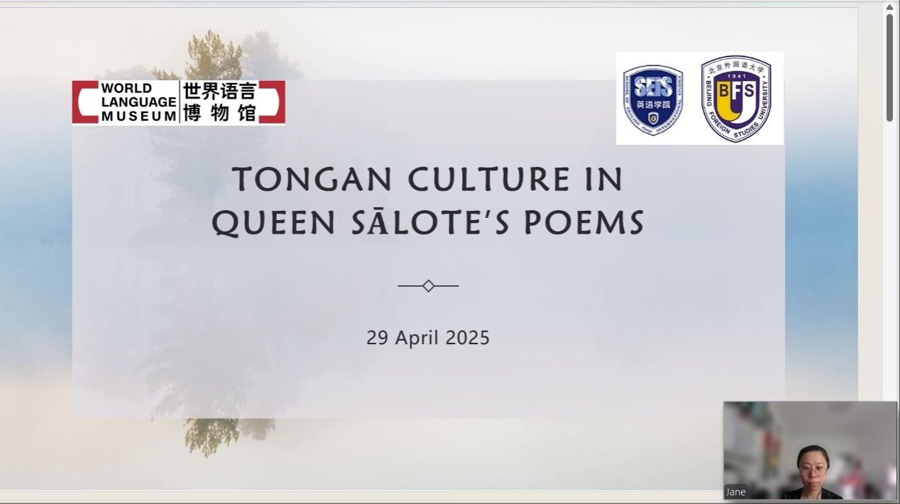 2025年4月29日下午,应北京外国语大学英语学院南太平洋研究中心和世界语言博物馆的邀请,汤加语外国专家梅莱奈伊特·塔乌莫艾富拉乌(Melenaite Taumoefolau)博士在线上做了题为“夏洛特女王诗中的汤加文化”(Tongan Culture in Queen Sālote’s Poems)的讲座。讲座由英语学院教师李菅主持,来自校内外多名师生参加了本场讲座。