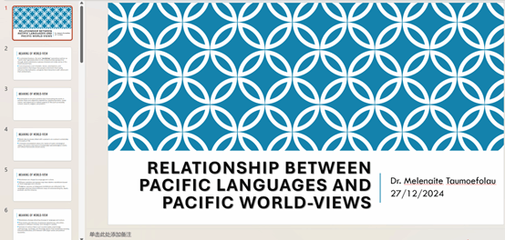 2024年12月27日下午,应北京外国语大学英语学院南太平洋研究中心邀请,汤加语外国专家梅莱奈伊特·塔乌莫艾富拉乌(Melenaite Taumoefolau)博士在线上做了题为“太平洋语言与世界观”(Relationship between Pacific Languages and Pacific World-views)的讲座。讲座由英语学院教师李菅主持,来自校内外多名师生参加了本次讲座。