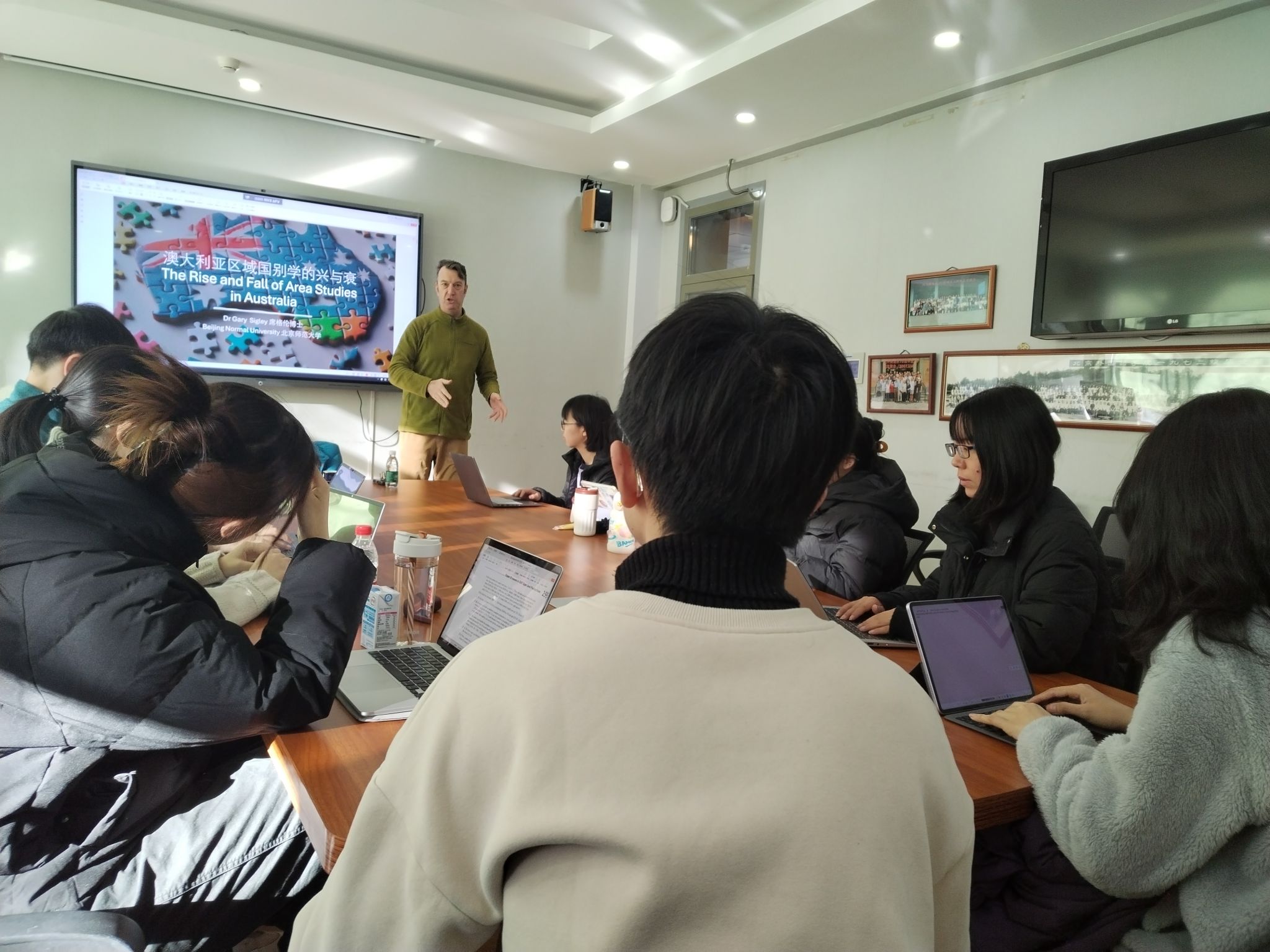 12月18日上午,受英语学院澳研中心邀请,北京师范大学人文地理学教授席格伦博士(Gary Sigley)在北外英语学院111会议室举办讲座,题目是 “焦虑的国家案例研究:澳大利亚为何持续未能发展亚洲识能”。讲座由英语学院澳研中心主任李建军主持,澳研中心师生参加。