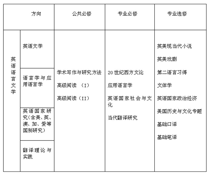 ——课程涵盖北京外国语大学英语语言文学专业下英美文学、语言学与应用语言学、英语国家研究、翻译理论与实践四个方向的主干课程。课程包括公共必修课3门、专业必修课4门、专业选修课8门。